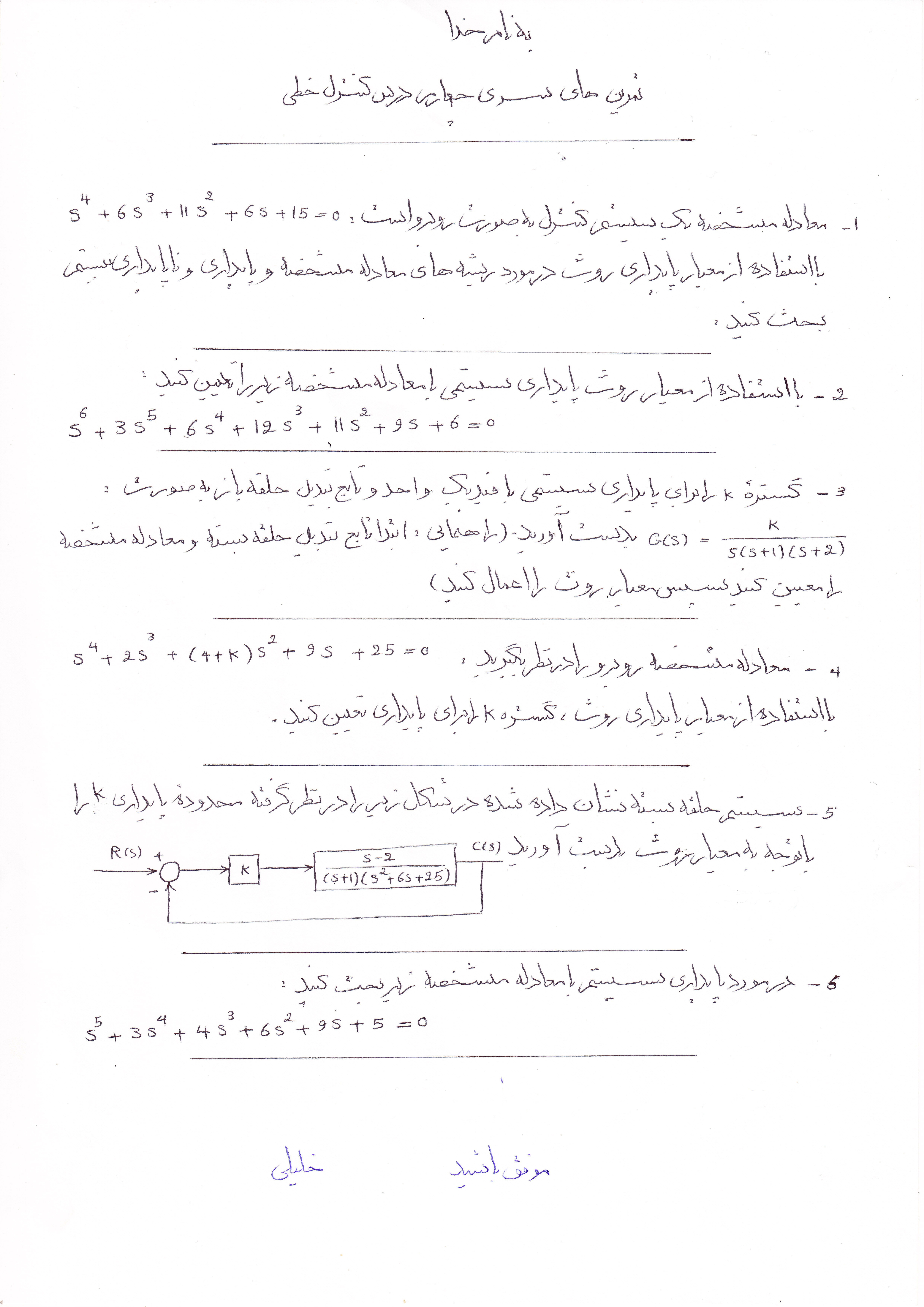 دانشجویان گرامی تمرینهای سری چهارم "سیستمهای کنترل خطی" مربوط به روش راوث در ادامه ضمیمه شده است.